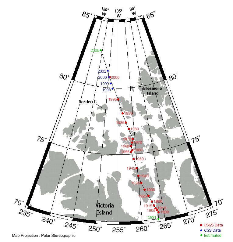 Fig. 3. Movement of the Earth's North Magnetic Pole Over Time. Diagram constructed from data on the U. S. Geological Survey's (USGS's) website and from the Canadian Geological Survey's (CGS's) website. (Refer to the latter URL for a review of the history of the search for the north magnetic pole and how its position is determined and tracked). Note that the projected year-2005 position was made by the USGS.