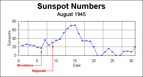 Graph of daily sunspot frequency, August 1945It would appear that the worldwide turmoils (physical, mental, and spiritual) associated with these fearsome nuclear blasts were reflected rather quickly upon the Sun in the days immediately following the explosions. But then, the reflection waned as people began to realize that the war would soon be over. (Japan agreed to surrender on August 14, and did so formally on September 2, 1945). Note that 1945 was a year near the beginning of a new solar cycle (number 18), when daily sunspot numbers ranged from zero to only roughly 70. If this one case holds up, and sunspots are found to respond to global or semi-global events of great importance to humanity, we might expect those other responses to be visible as sunspots in days immediately following each event. As far as I can tell, this has never been researched. It is well to remember, however, that “one correlation does not a true relationship prove.”