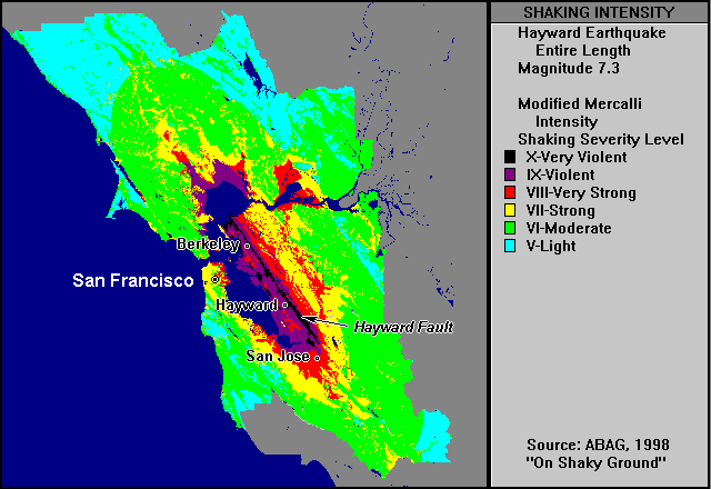 Earthquakes large enough to destroy San Francisco (1152-11) could devastate Silicon Valley (the San Jose area) as well. And many computer networks throughout California could be destroyed too. Refer to the shaking-intensity map for the Bay area compiled by the Association of Bay Area Governments (ABAG) for an M 7.3 earthquake on the Hayward fault.