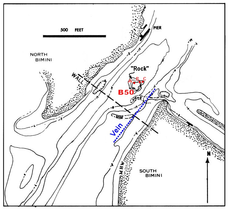 Fig. 3 - Potential location of a “wall,” to act as a dam for hydroelectric power generation at the tidal inlet between North and South Bimini. Possible trend of hypothetical mineralized vein is also shown in blue. Bathymetric contours are in feet below mean high water. Sample station B50, for the geochemical survey described later, is shown here to illustrate the spatial relation of samples B50A, B, and C as well as their proximity to thevein inferred by Hutton in 1961. In a later (1996) book, Coming Earth Changes6, Hutton elaborated on other readings dealing with Atlantis and Bimini.